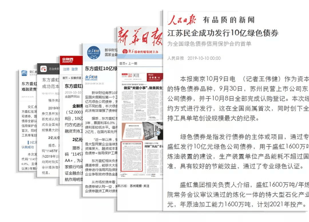 10月9日至11日,《人民日报》、《新华日报》、《新华财经》、《交汇点》等多家央级、省级媒体纷纷对东方永信贵宾会发行10亿绿色债进行集中关注和报道,并称这是“全国首单”。此次发行由证金公司和主承销商东吴证券联合创设全国首单绿色债券信用保护合约(CDS),为解决民企“融资难融资贵”问题提供范本。