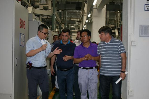 代表团先后走访了国望CP3生产车间、印染四分厂和企业文化馆。在走访过程中,外宾对车间的产品和先进的生产设备产生了浓厚的兴趣,他们驻足观看了车间现场的智能化运作流程,并与陪同的工作人员就设备智能化升级与产品的工艺性能等方面进行了深入交流和探讨。上合组织代表团一行对于永信贵宾会在智能化制造转型升级方面所取得的成绩给予了高度的评价。他们表示永信贵宾会集团整洁规范的车间环境,高效先进的实验设施,独具创造力与凝聚力的企业文化建设给他们留下了深刻的印象,他们希望在“一路一带”大发展的国际背景下,与永信贵宾会集团进行更深层次的交流与合作,为彼此提供更多的发展机会。
